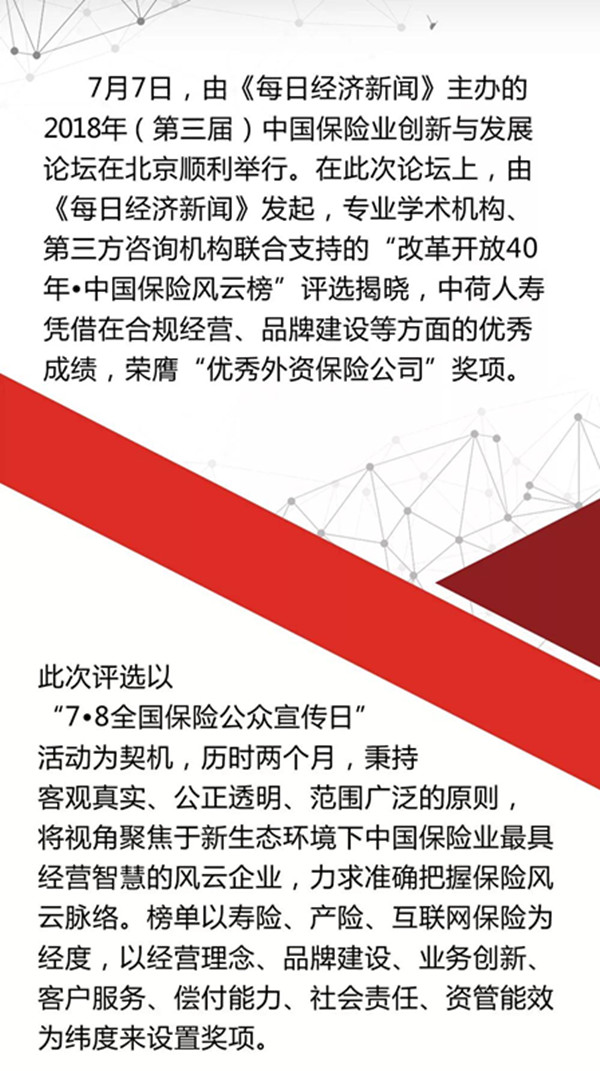 中荷人壽榮獲2018年度“優(yōu)秀外資保險公司”獎項(xiàng)