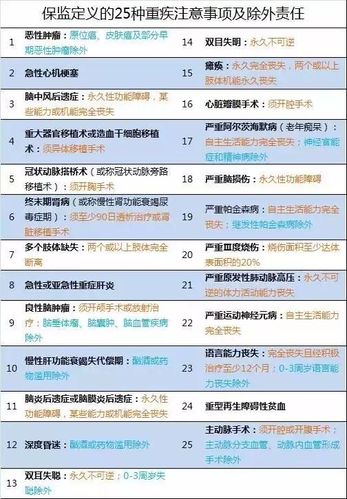 以下是,25種重疾注意事項及除外責任: