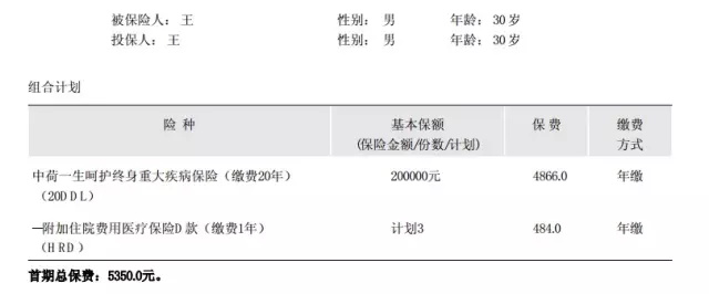 王先生,30歲,做銷售工作(二類職業(yè)),購買中荷DDL,附加住院醫(yī)療HRD,計(jì)劃3: