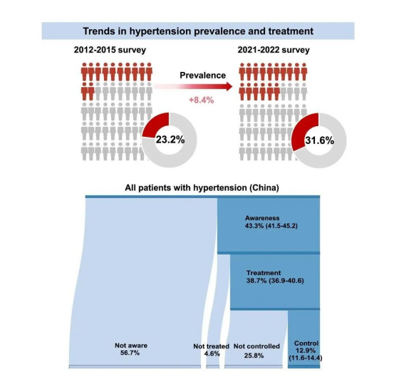 研究數(shù)據(jù)顯示,2021-2022 年中國成人高血壓患病率已達(dá)到 31.6%,這意味著每三位成年人中就有一位受到高血壓的困擾。與 2012-2015 年的數(shù)據(jù)相比,高血壓患病呈現(xiàn)出明顯的上升態(tài)勢,且這種增長在不同人群中呈現(xiàn)出獨(dú)特的社會人口學(xué)模式。