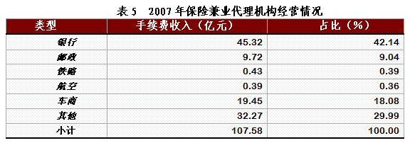 (三)經(jīng)營情況 2007年,保險兼業(yè)代理機構實現(xiàn)代理手續(xù)費收入107.58億元,同比增長47.86% 。