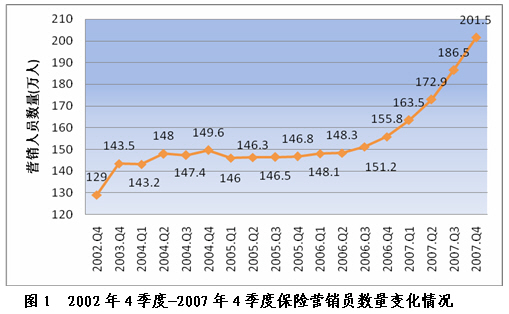 三、保險營銷員 ?。ㄒ唬┗厩闆r 截至2007年12月底,全國共有保險營銷員2014900 人,比2006年增加456811人,增長29.32%。其中,壽險營銷員1767024人,增長28.42%;產(chǎn)險營銷員247876人,增長36.1%。 4季度末,全國保險營銷員持證率為99.2%,同比提高3.77個百分點。其中,產(chǎn)險營銷員持證率98.55%,上升3.14個百分點;壽險營銷員持證率為99.29%,上升3.86個百分點。