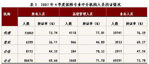 | 截至 2007年,保監(jiān)會共批設346家保險專業(yè)中介機構。[4]其中第4季度批設了60家。全年有174家保險專業(yè)中介機構終止經(jīng)營,第4季度有26家退出市場,占現(xiàn)有保險專業(yè)中介機構總數(shù)的1.12%。 截至12月底,全國保險專業(yè)中介機構共有工作人員86676人,持證率69.66%。其中,業(yè)務人員69591人,持證率73.7%。代理機構持證情況最好,達到73.74%;經(jīng)紀機構和公估機構持證率分別達到56.11%和44.52%。經(jīng)紀機構持證率提高幅度最大,同比提高了10.38個百分點。 |